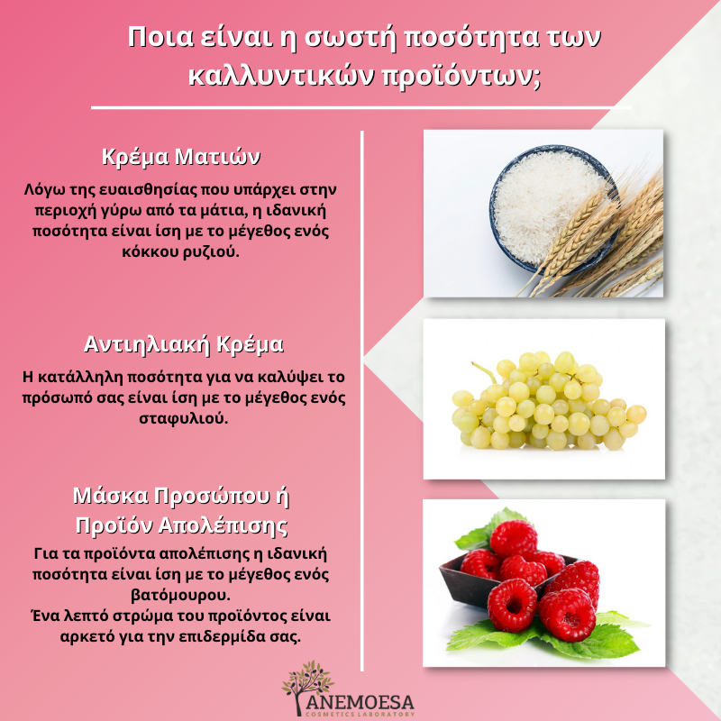 Η κατάλληλη ποσότητα για να καλύψει το πρόσωπό σας είναι ίση με το μέγεθος ενός σταφυλιού. Μην ξεχνάτε να βάζετε αντηλιακή κρέμα όλους τους μήνες του χρόνου και να την εφαρμόζετε και στην περιοχή του λαιμού.